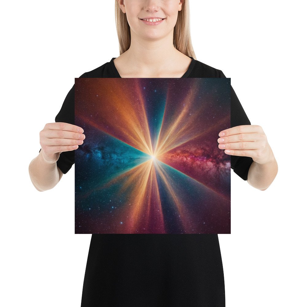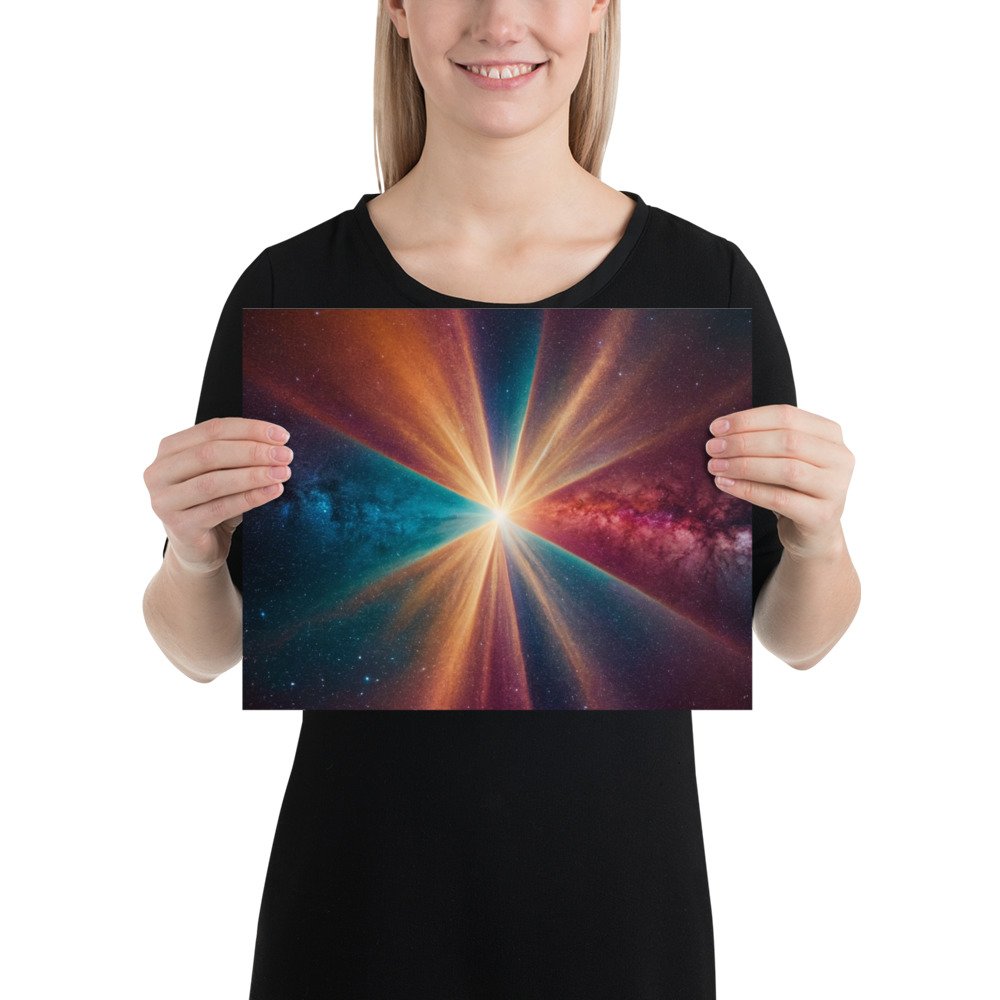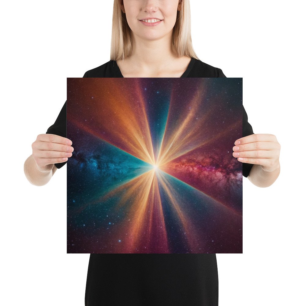 This Cosmic Light Burst Wall Poster is a premium physical artwork created for modern, astral, and minimalist spaces. The powerful central burst of light radiating through deep cosmic colors represents expansion, clarity, and universal energy, making it an impactful focal piece for contemporary interiors.